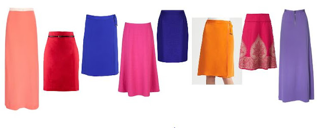 | Exemplos de saias coloridas mais indicadas para pessoas com pouca anca |